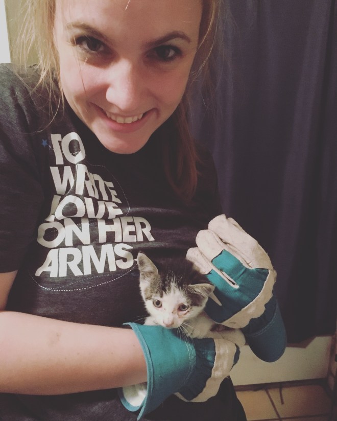 I got home from dance with these vast plans to cook dinner and jet glue my pointe shoes. After dinner was done, I walked to my parent’s house to get my dog. (Mom likes to have her during the day. It’s one of those kinds of adorable that almost makes you sick, haha.) As I was walking up to the house, I heard a meowing. Most of our cats don’t meow unless they’re hungry, during which its a chorus of different tones of cat sounds. (hi, we have 15 acres and many outside cats to help with rats and–come to find out last night–snakes. I swear we aren’t crazy cat people…yet.) My sister had heard a cat under her hood, but hadn’t been able to get it out. The thing had somehow gotten itself up near her engine and wouldn’t find its way out. She drove to work and back with it yesterday, heart breaking as she heard it meow the whole way home. I noticed it only meowed when someone was near, so I turned on the flashlight on my phone and looked to see if I could see it. (We left the hood open for two days, hoping it’d come out, but all it managed was to pop its head out every now and then.) I went inside and recruited help, getting the gloves from my sisters front seat. I could touch the little sucker, but it would get scared and run to a different part of the engine. I even ended up under the car a few times, which is where my bun decided it had had it. Mom noticed it would follow the sounds if you meowed back at it, so we tried to coax it out the top where it would pop it’s little head out. That didn’t work, so dad poked at it to try and scare it in the right direction. It ended up right near the tire so I got back under the car and meowed at it. Dad lost sight of it, but only because I was staring the kitten in the face. I kept meowing, and it literally followed my voice out of the car. Once it got onto the gravel, it freaked out and ran to the tire, where I grabbed it and held it close to me. Dad was impressed, my sister super grateful. Mom had been praying the whole time we’d be able to get it out, and we did. We were a bit afraid to just let it go outside, that it might try and climb back in, so we took it inside and put it in the cat carrier with some food and water. Hoping my friend will be able to give it a good home.