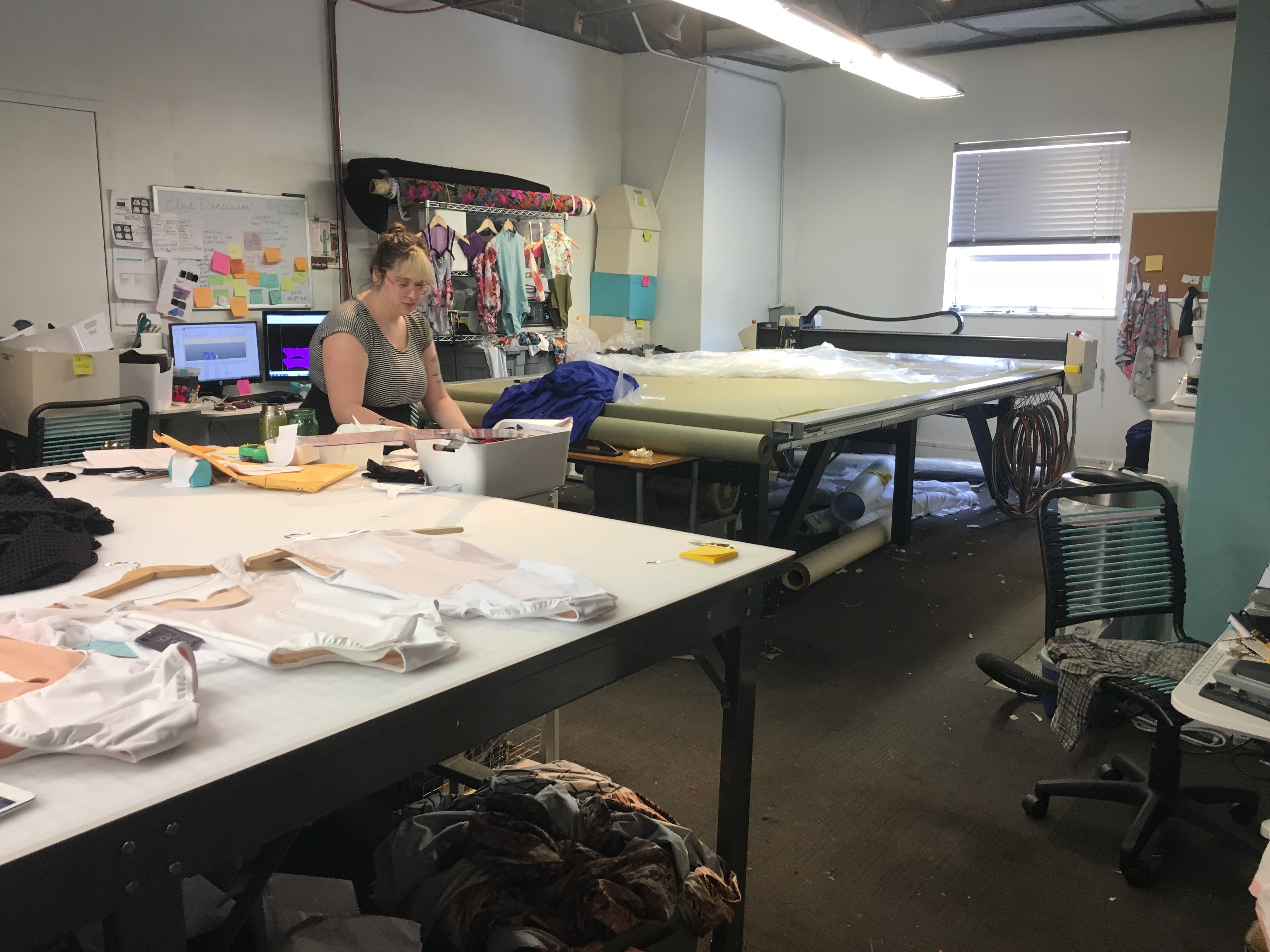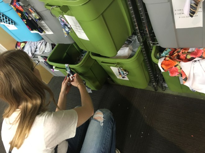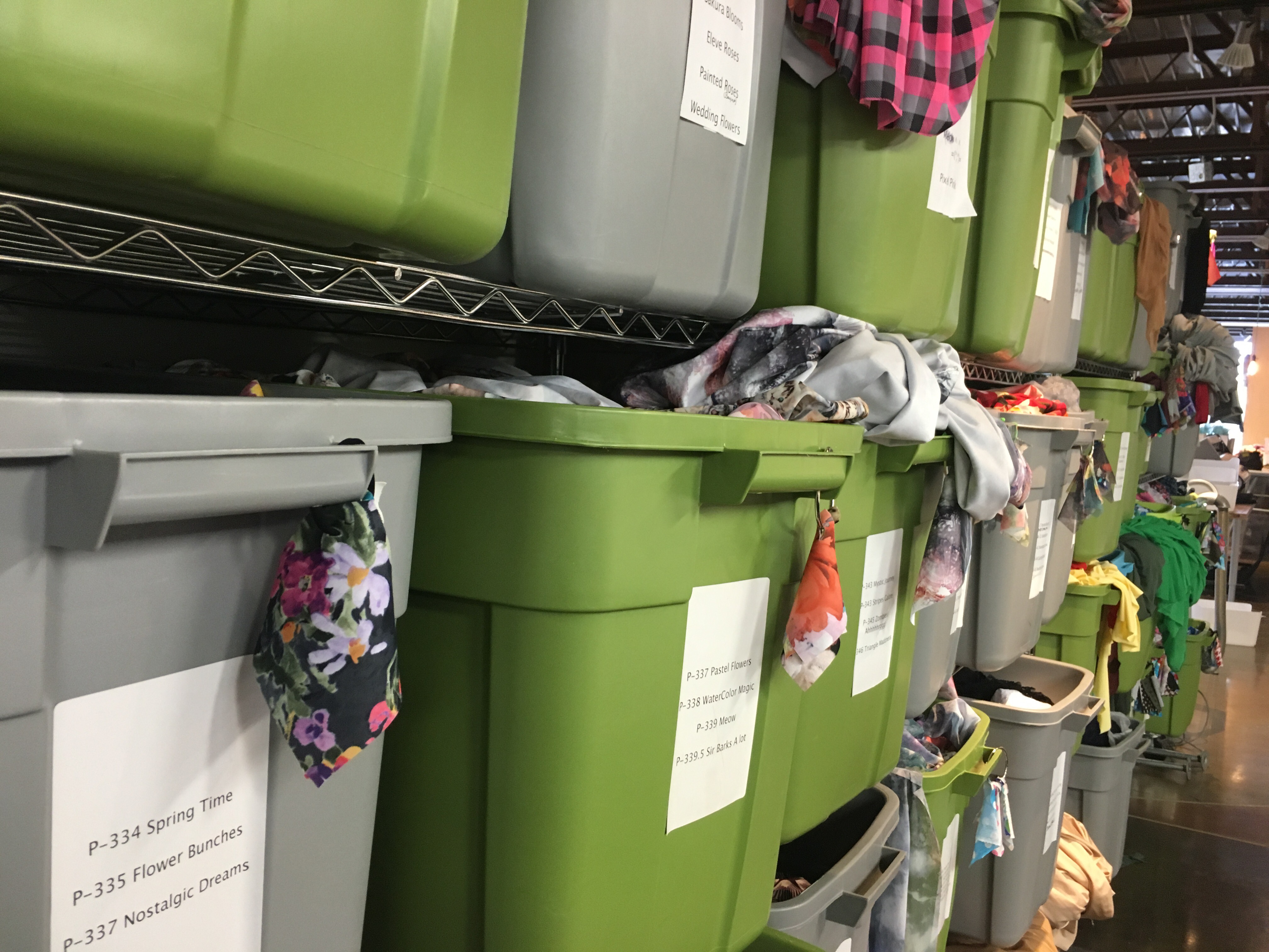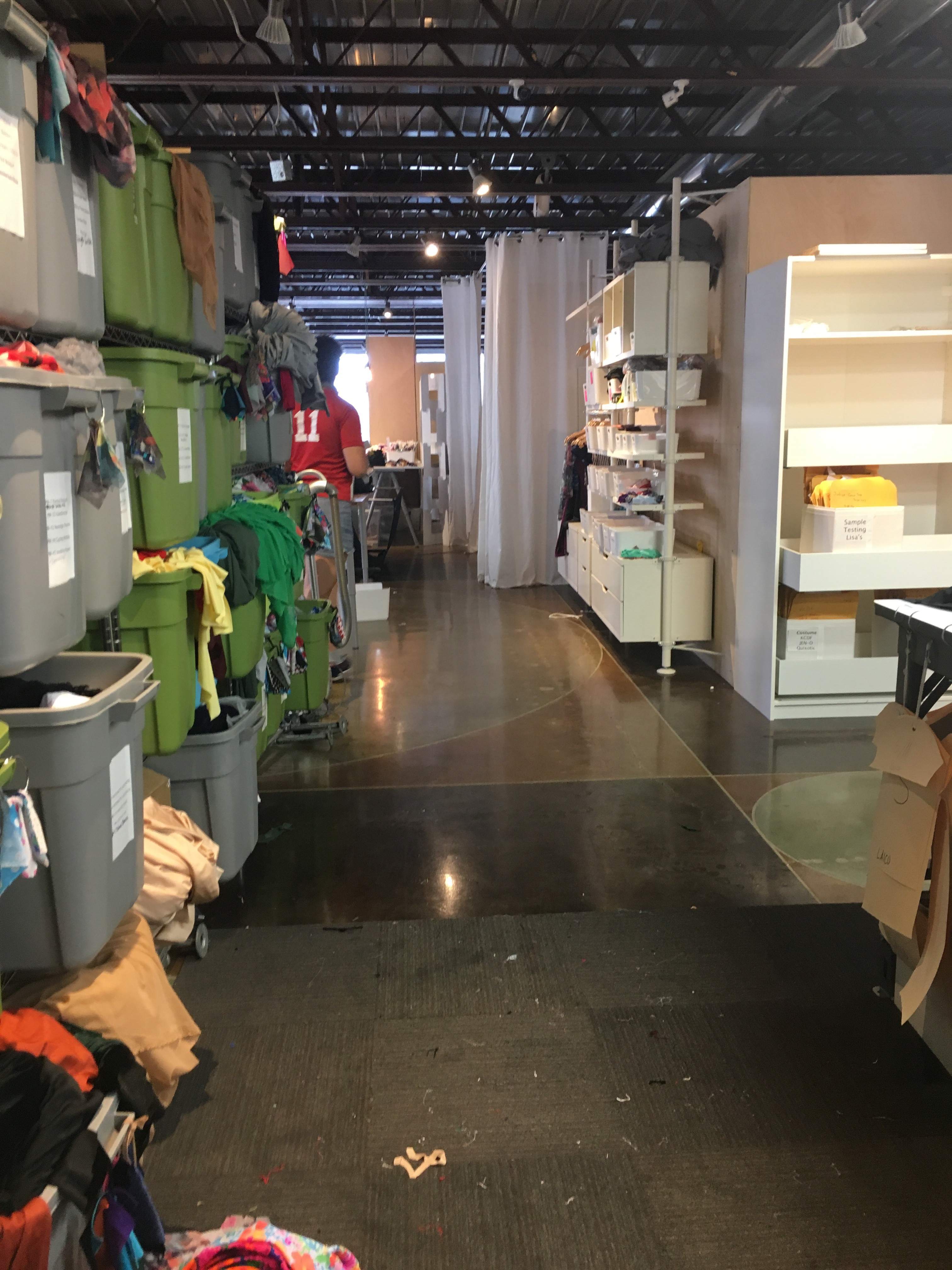 The way the layout works, the sewing machines are behind the front wall, if you will, and behind the stand alone wall is where they keep all the fabrics in organized bins. It’s also where they cut all the fabrics.