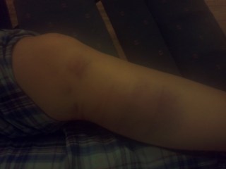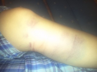 I still don’t know where the car came from. It was all very confusing for me as it was literally the exact moment I took my foot off the brake and was intending to turn after two cars passed. I assume those two cars passed, because they were cars and no one else was hit except for me and the truck that jumped my hood and came back off my car. Somehow I got the blame for this whole ordeal, and it was all pretty traumatic, but I typically play it off. After all, I’m okay. It shut down the entire street and my friends I was just with turned around to come make sure I was okay. My left leg hurt and I could feel a mass, but of course I was in skinny jeans so I couldn’t see. I turned down an ambulance ride, knowing it’d be ridiculously expensive, and sat on the curb. Some lady I don’t know came from I don’t know where to check on me. She stayed with me until my friends got there which I appreciate more than words could ever say. I was terrified, and she brought me peace. (Thanks, lady I don’t know.) I literally walked back to my house, as this all happened so close to home. My friends that came back around to make sure I was okay had a new friend with her who was conveniently knowledgeable in medical things. She looked at my leg and suggested an x-ray. Shana told me to get some things and that I would stay the night with her. I told her I would be fine, but did what she said anyway. She took me to the ER in Portland, since it’s a smaller town (The town she lived in, across the bridge) and we would more than likely get in and out a lot quicker. I got signed in exactly at midnight, and my hospital bracelet says 11/11/11. (I still have it.)