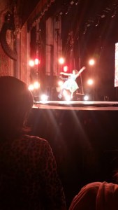 We show the usher lady our tickets (oh, ps, a lovely usher lady pointed us kindly in a shortcut part of the merch line. I think Judy’s red hair was luck for us) and she tells us it’s all the way down towards the front and to the right. (aka, center)